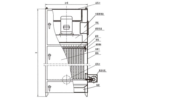 含塵氣體進入箱體,經(jīng)扁袋過濾器過濾,粉塵被阻擋在外表面,凈化后的氣體經(jīng)風(fēng)機、消聲器排出。濾袋工作一段時間后,外表面粘附的粉塵量增加,影響了除塵效果,此時開啟清灰機構(gòu)工作,抖掉濾袋表面的集塵,使除塵器始終處于良好的工作狀態(tài)。落入抽屜中的粉塵定期 。